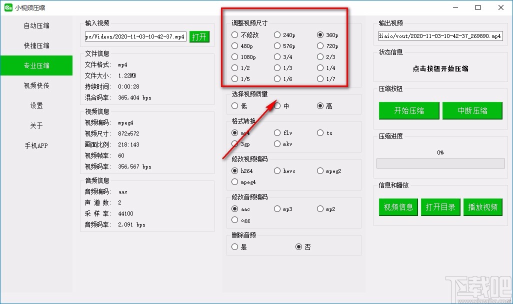 4.然后我们在专业压缩页面中找到“调整视频尺寸”选项,该选项下方就是具体的视频尺寸选项,我们根据自己的需要进行选择。