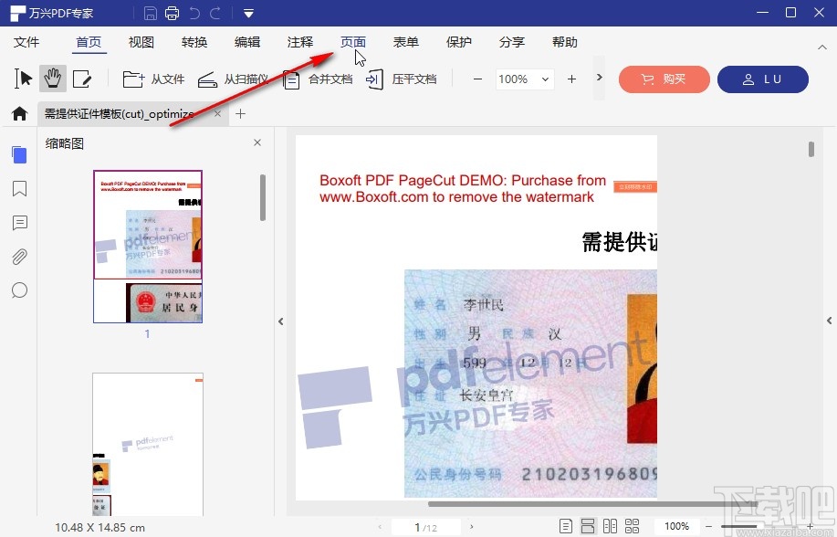 2.点击打开这个PDF文件之后,下一步在界面的上方找到页面这个选项并点击,进入到页面编辑模块。