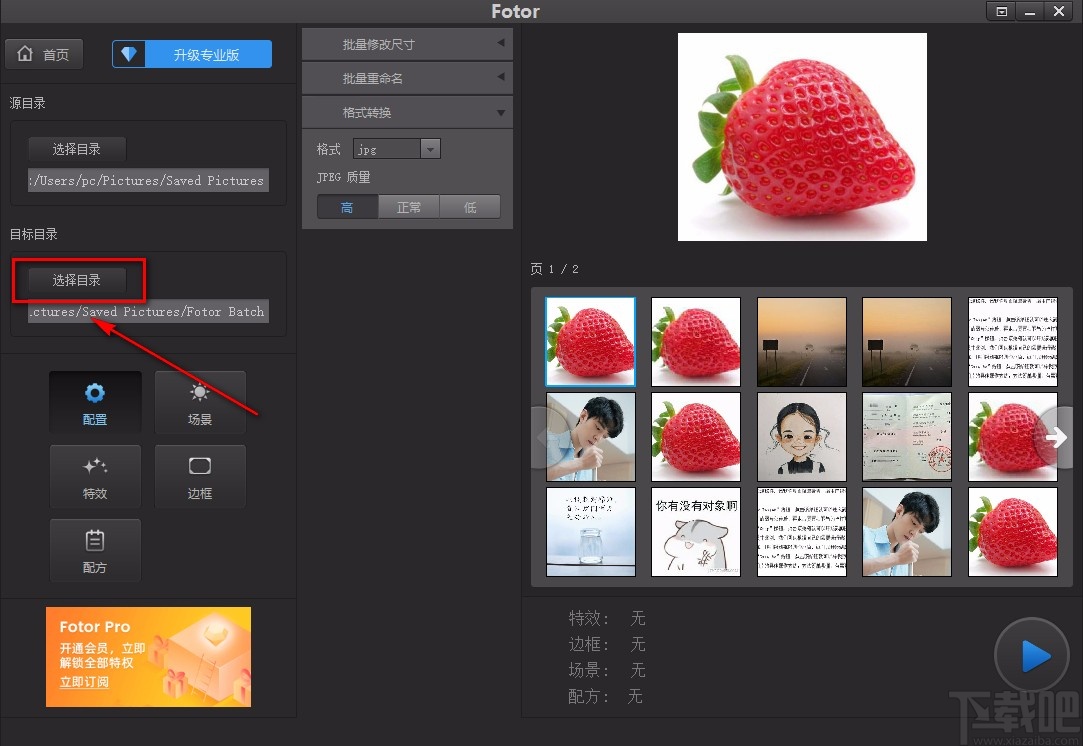2.进入到批处理页面后,我们在界面左上方找到“源目录”一栏,点击该栏下方的“选择目录”按钮,就可以进入到文件添加页面。