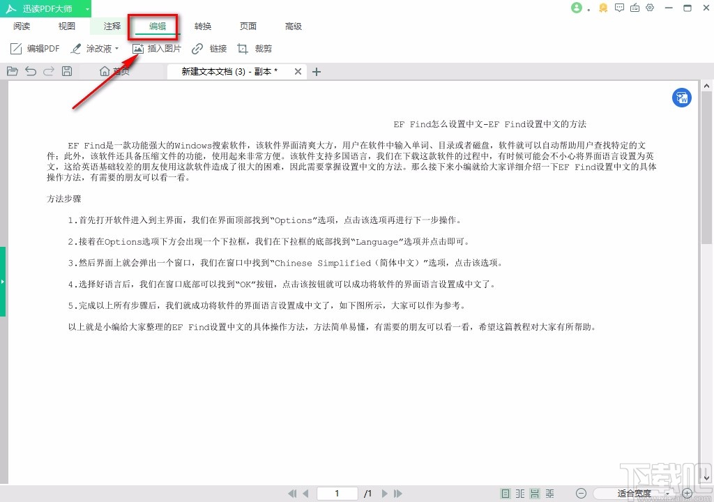 3.将PDF文档打开后,我们在界面上方找到“编辑”选项卡,点击该选项卡进入到编辑模式。
