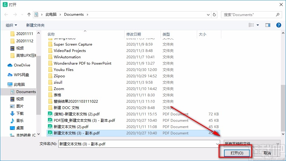 2.接着在文件添加页面中,我们选中需要插入图片的PDF文档,再点击页面右下角的“打开”按钮即可。