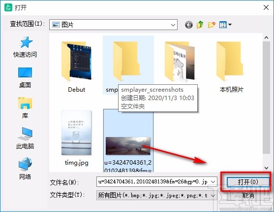 5.紧接着界面上会弹出一个打开窗口,我们在窗口中找到需要添加的图片并选中,再点击窗口右下角的“打开”按钮即可。