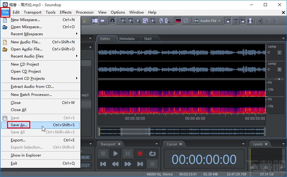 6.最后我们在剪切完成之后,点击左上角的file文件选项卡,然后在出现的这个文件菜单中找到Save As这个另存为选项,准备将文件另存为保存下来。