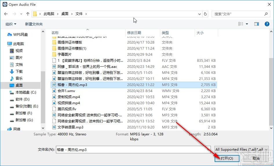 2.点击这个打开音频文件之后,下一步在出现的选择音频文件界面中,选中目标音频文件之后点击右下角的打开按钮。