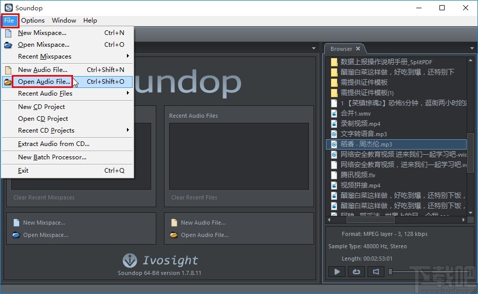 1.首先第一步我们打开软件之后,在软件界面的左上角找到file这个文件选项卡,然后在出现的菜单界面中选择open audio file这个打开音频文件选项并点击。