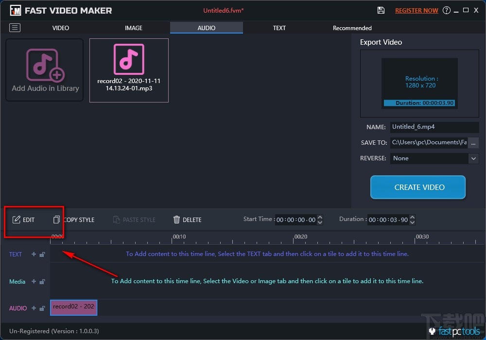 5.然后在时间轨道上点击音频文件,再点击时间轨道左上方的“EDIT”选项即可。