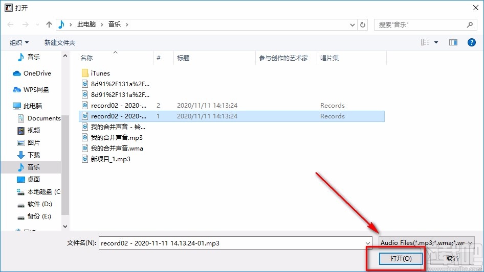 3.在文件添加页面中,我们选中需要进行剪切操作的音频文件,再点击页面右下角的“打开”按钮即可。