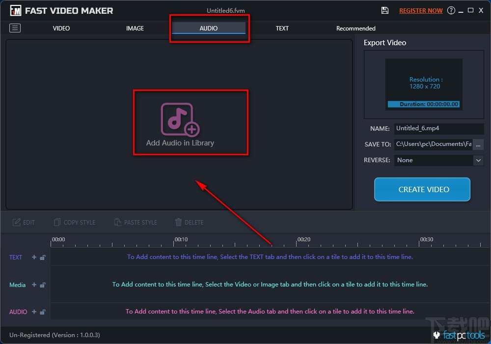 2.接着我们在界面上方找到“AUDIO”选项并点击,再点击界面上的“Add Audio in Library”选项打开文件添加页面。