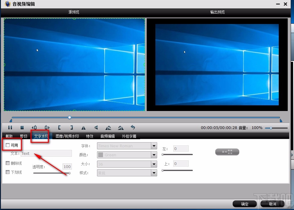 4.然后界面上就会出现一个音视频编辑窗口,我们在窗口下方点击“文字水印”选项,并在界面左下方勾选“可用”选项。