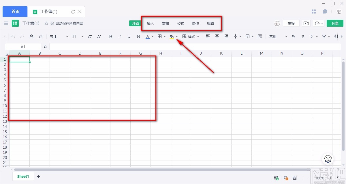 5.在上一步中点击“空白表格文档”选项后,就可以看到如下图所示的界面,我们在界面上的表格中就可以输入内容;同时还可以利用界面上方的“插入”、“数据”、“公式”等工具,来对表格内容进行设置。
