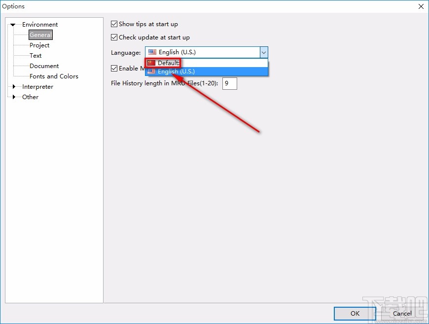4.接着我们在窗口上方找到“Language”选项,该选项后面有一个下拉按钮,我们点击该按钮,在下拉框中选择“Default”选项。