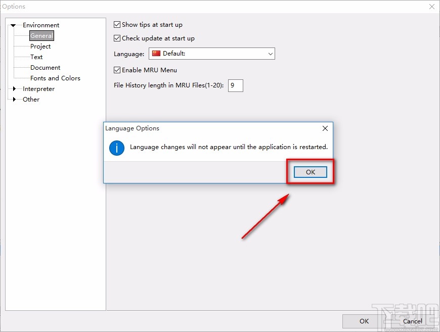 6.随后界面上会弹出一个提示框,提示我们需要重启软件才能使语言设置生效,我们点击框中的“OK”按钮即可。