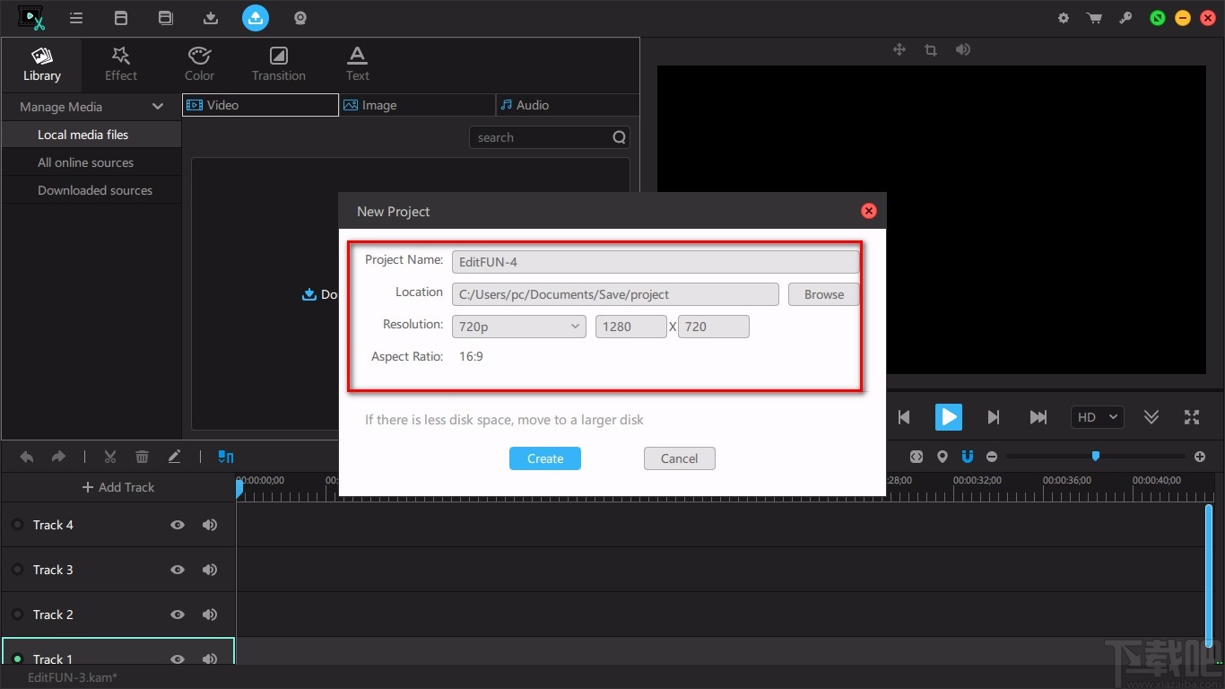 2.接着界面上就会出现一个New Project窗口,我们在窗口中设置好项目的保存位置、分辨率等参数,再点击窗口底部的“Create”按钮即可。