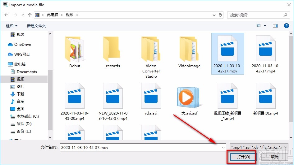 6.之后在文件添加页面中,我们选中需要导入的视频文件,再点击页面右下角的“打开”按钮,即可将视频导入软件中了。