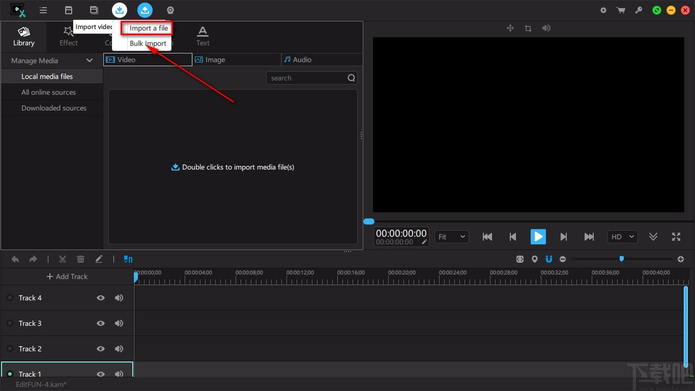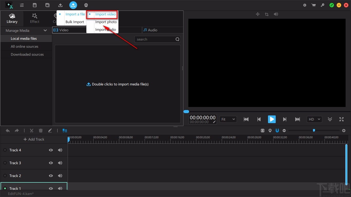 5.接下来我们在子下拉框中找到“Import video”选项并点击,就可以进入到文件添加页面。