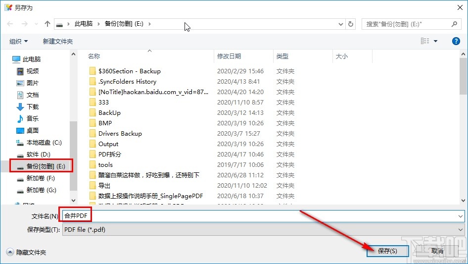 5.点击继续按钮之后就打开选择保存合并PDF文件路径的界面了,在这个界面中我们选中想要保存的目标位置之后,设置好文件名称,点击右下角的保存按钮即可。
