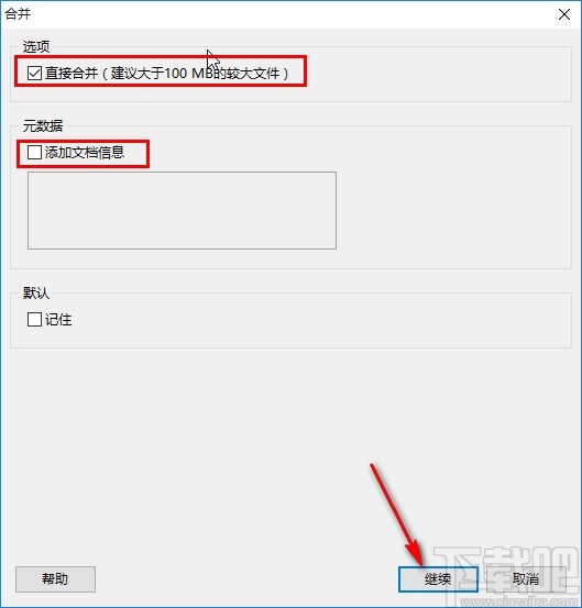 4.打开这个合并PDF文件的界面之后,我们找到“直接合并”选项勾选起来,然后可以根据自己的需求来选择是否勾选“添加文档信息”这个选项,最后点击继续按钮。