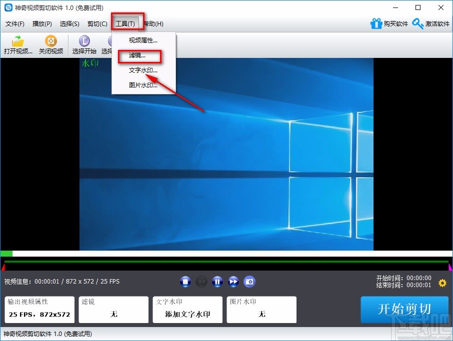3.将视频文件添加到软件后,我们在界面上方找到“工具”选项,点击该选项,其下方会出现一个下拉框,在下拉框中选择“滤镜”选项。