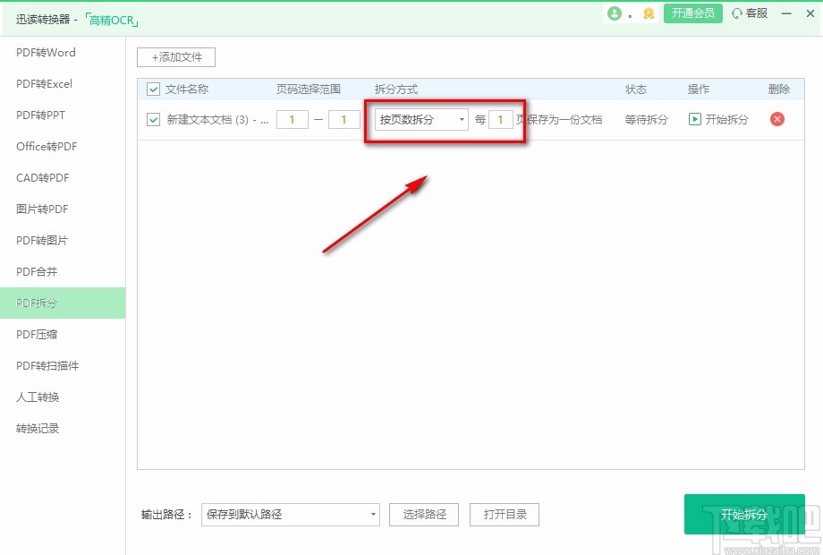 7.在上一步中如果选择“按页数拆分”选项,则在该选项后面的文本框中输入多少页保存为一份文档的具体数值。