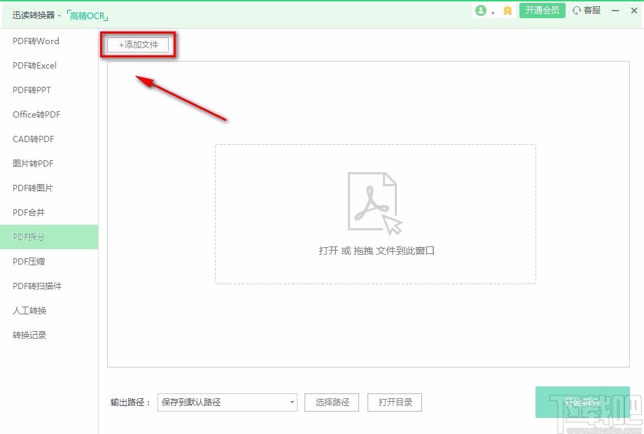 3.在PDF拆分页面中,我们在页面左上方找到“添加文件”选项,点击该选项就能够打开文件添加页面。
