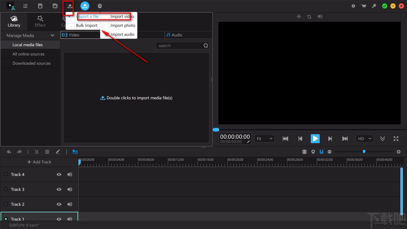 3.然后我们在界面左上方找到下图所示的导入按钮并点击,其下方会出现一个下拉框,在下拉框中选择“Import a file”选项,旁边会出现一个子下拉框,在子下拉框中点击“Import video”选项,就可以将视频添加到软件中。
