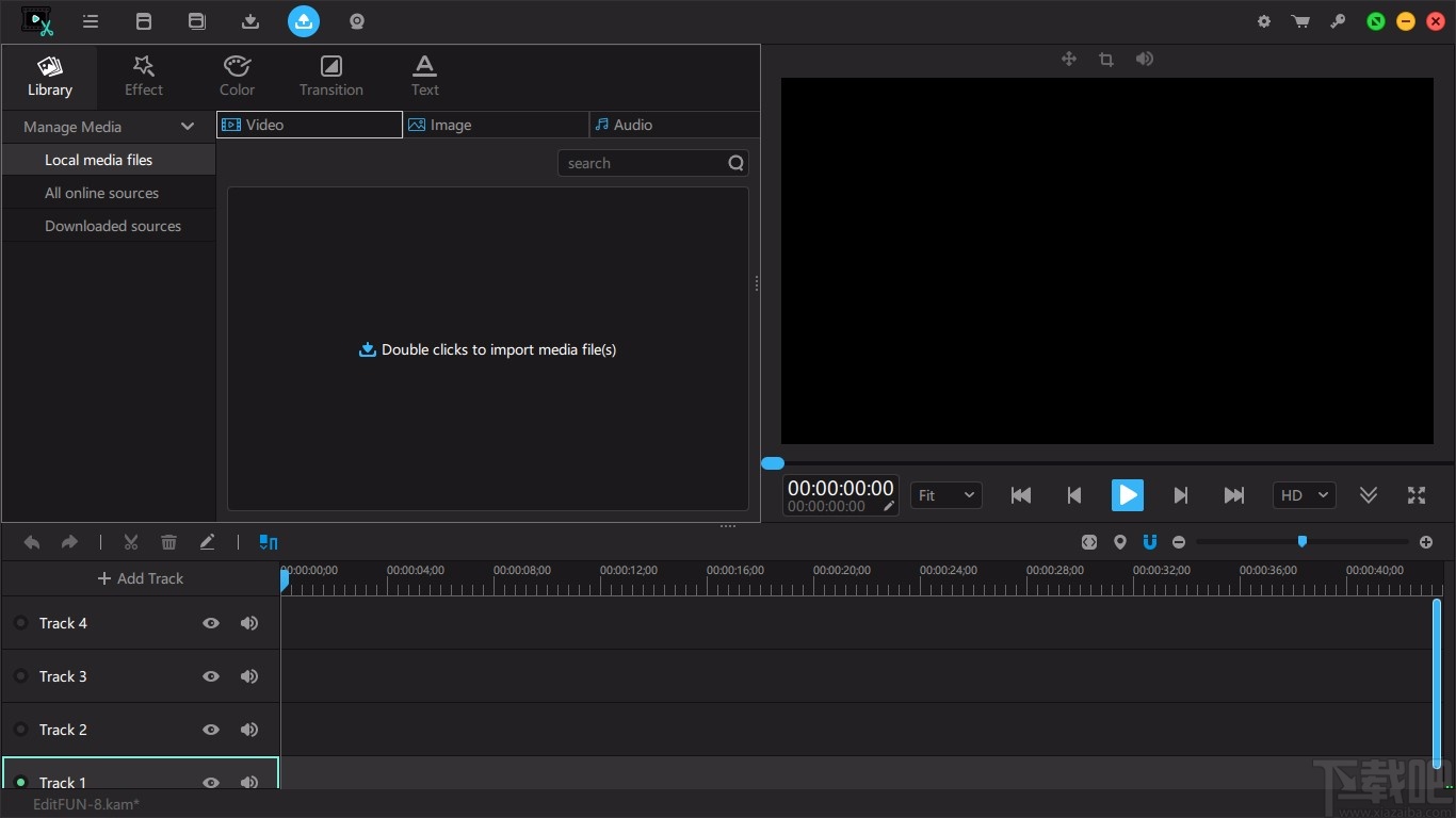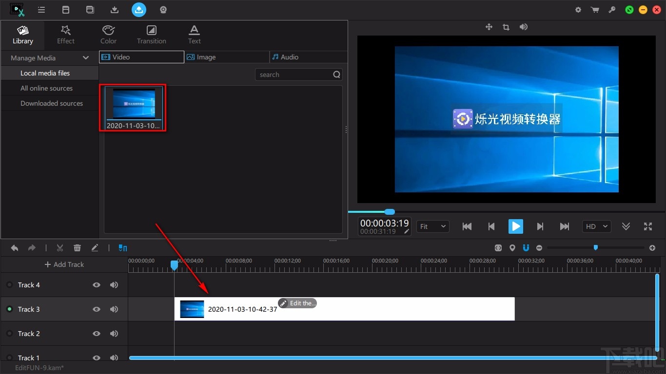 4.将视频添加到软件后,我们在界面左上方选中视频,并按住鼠标左键不动,同时移动鼠标,将其拖拽到下方的时间轨道上。