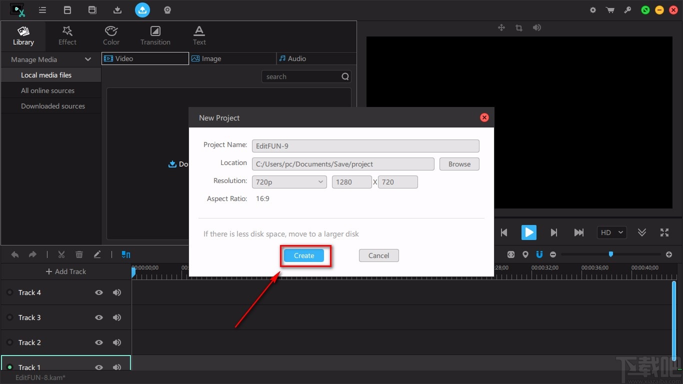 2.接着界面上就会出现一个窗口,我们在窗口中可以对项目名称、位置以及分辨率进行设置,再点击窗口底部的“Create”按钮即可。