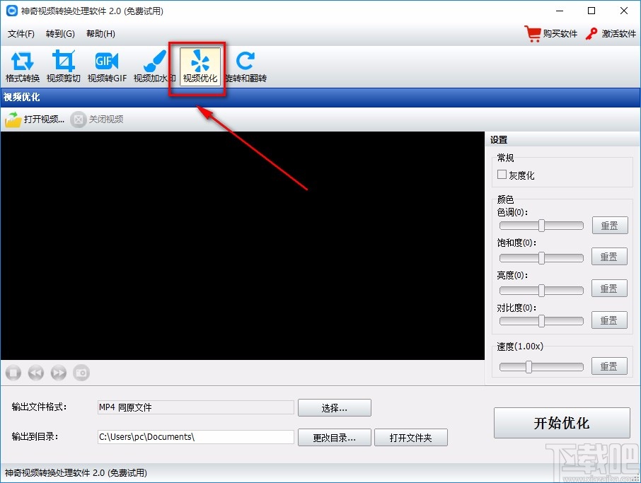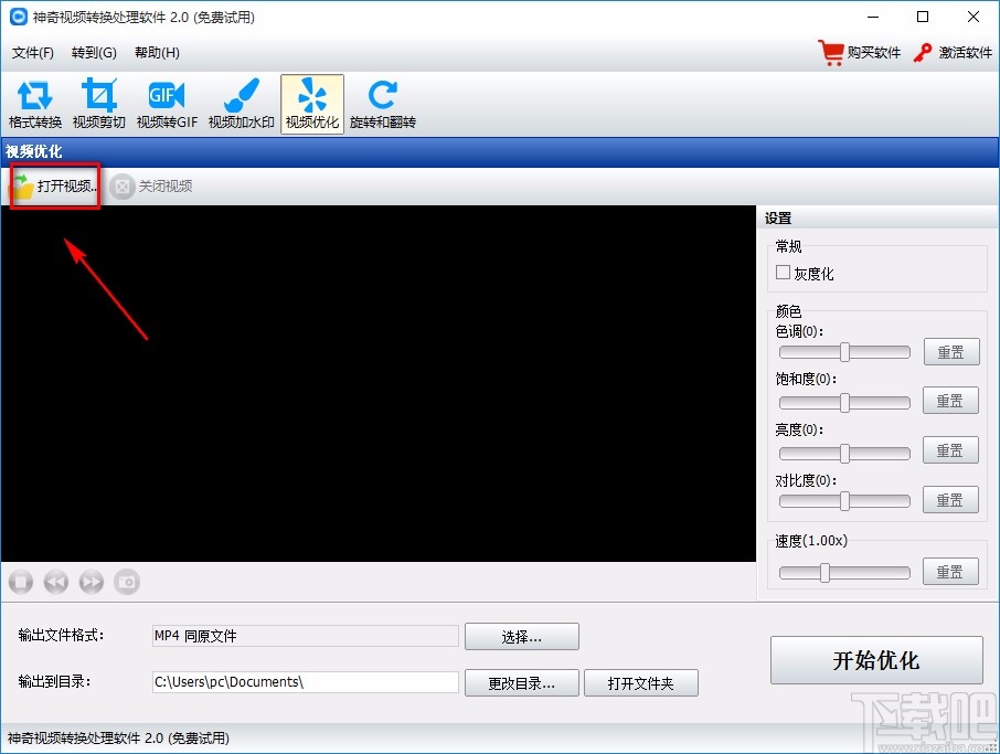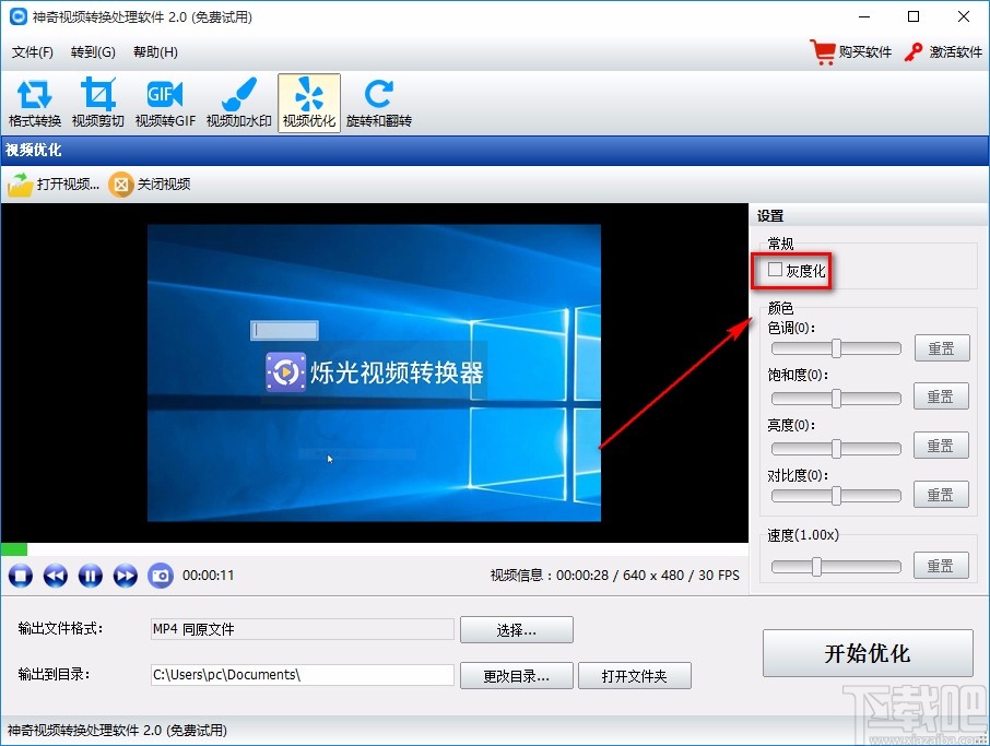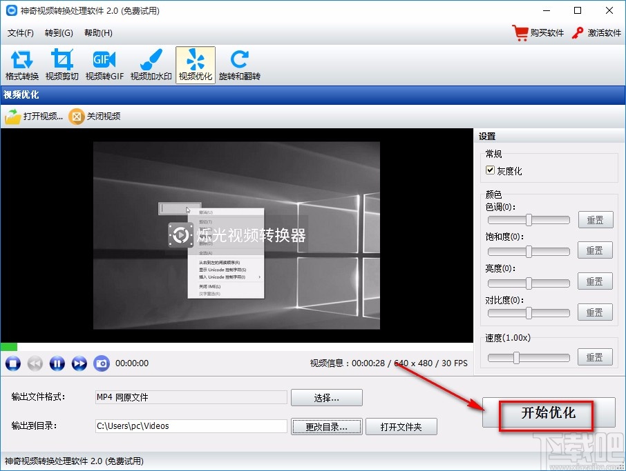 7.完成以上所有步骤后,我们在界面右下角找到“开始优化”按钮,点击该按钮就可以开始使视频灰度化了。
