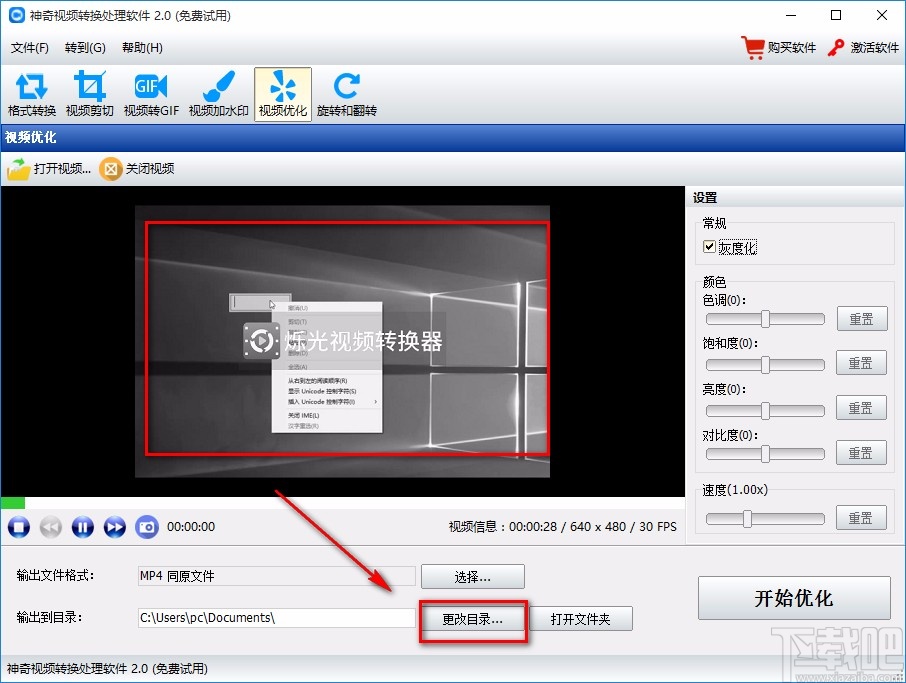 5.然后我们在视频预览窗口中就可以看到灰化后的效果图,如下图所示;这时候我们在页面下方点击“更改目录”按钮。