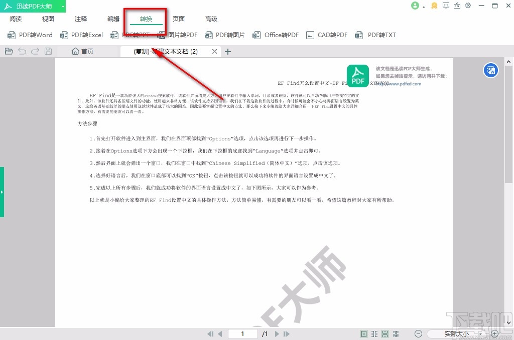 3.将PDF文件打开后,我们在界面上方找到“转换”按钮,点击该按钮,其下方会出现很多转换选项。