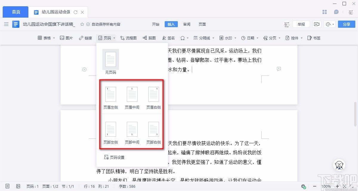 2.接着在插入页面中,我们在页面上方找到“页码”选项,点击该选项,其下方会出现一个下拉框,在下拉框中可以根据自己的需要选择页码在页面上的位置。