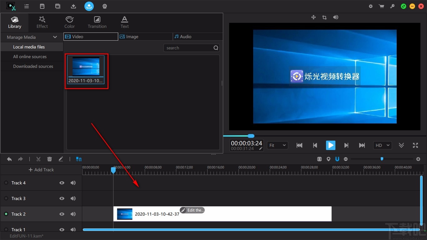 4.将视频添加到软件后,我们在界面左上方选中视频,并按住鼠标左键不动,同时移动鼠标,将其拖拽到下方的时间轨道上。