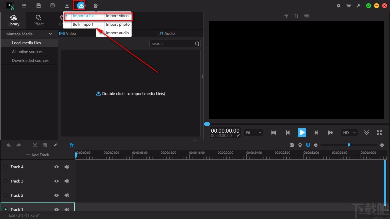 3.然后我们在界面左上方找到下图所示的导入按钮并点击,其下方会出现一个下拉框,在下拉框中选择“Import a file”选项,旁边会出现一个子下拉框,在子下拉框中点击“Import video”选项,就可以将视频添加到软件中。