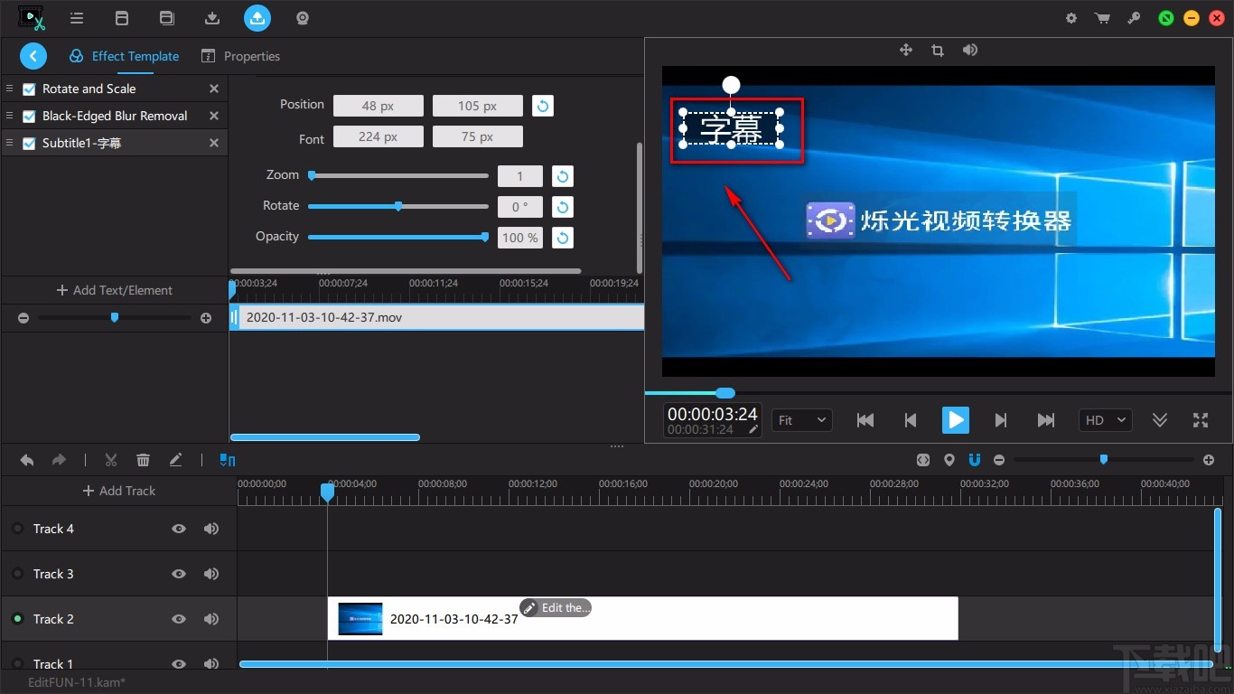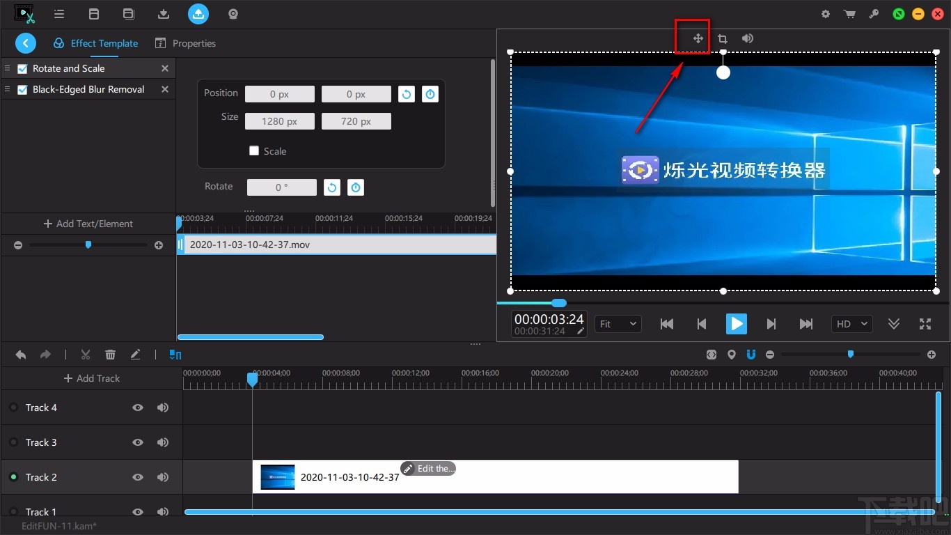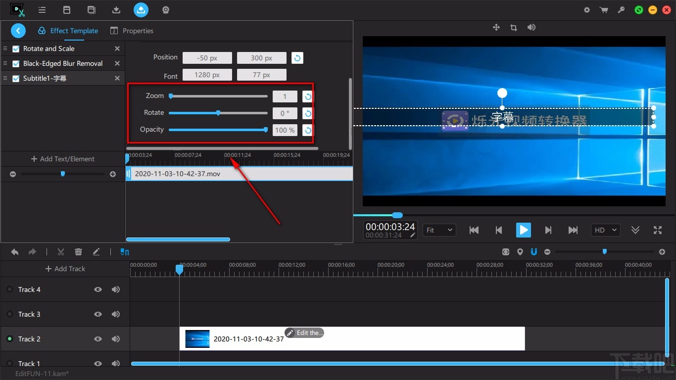10.接下来在界面上找到“Zoom”、“Rotate”、“Opacity”选项,分别表示缩放、旋转以及透明度的意思,我们分别拖动三个选项后面的小光标来调整这几个参数。