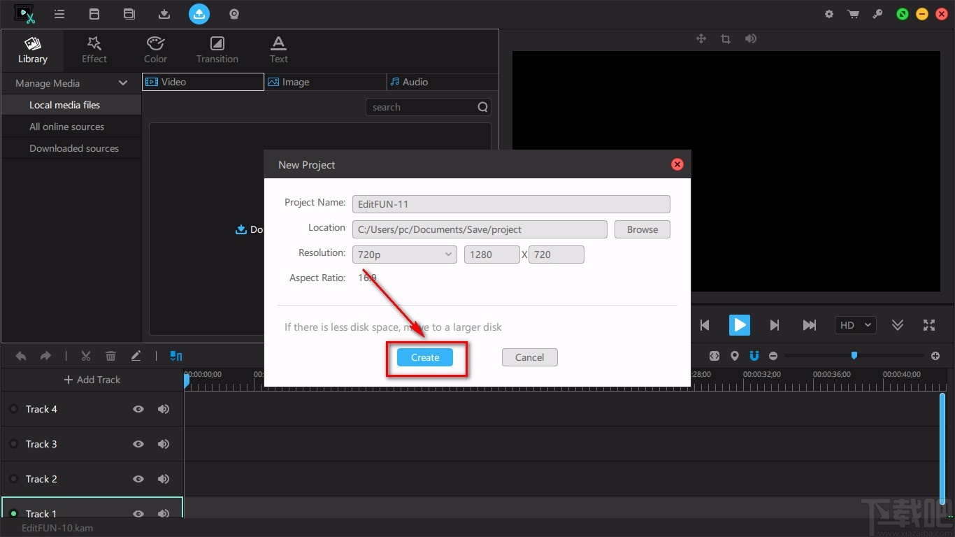 2.接着界面上就会出现一个窗口,我们在窗口中可以对项目名称、位置以及分辨率进行设置,再点击窗口底部的“Create”按钮即可。