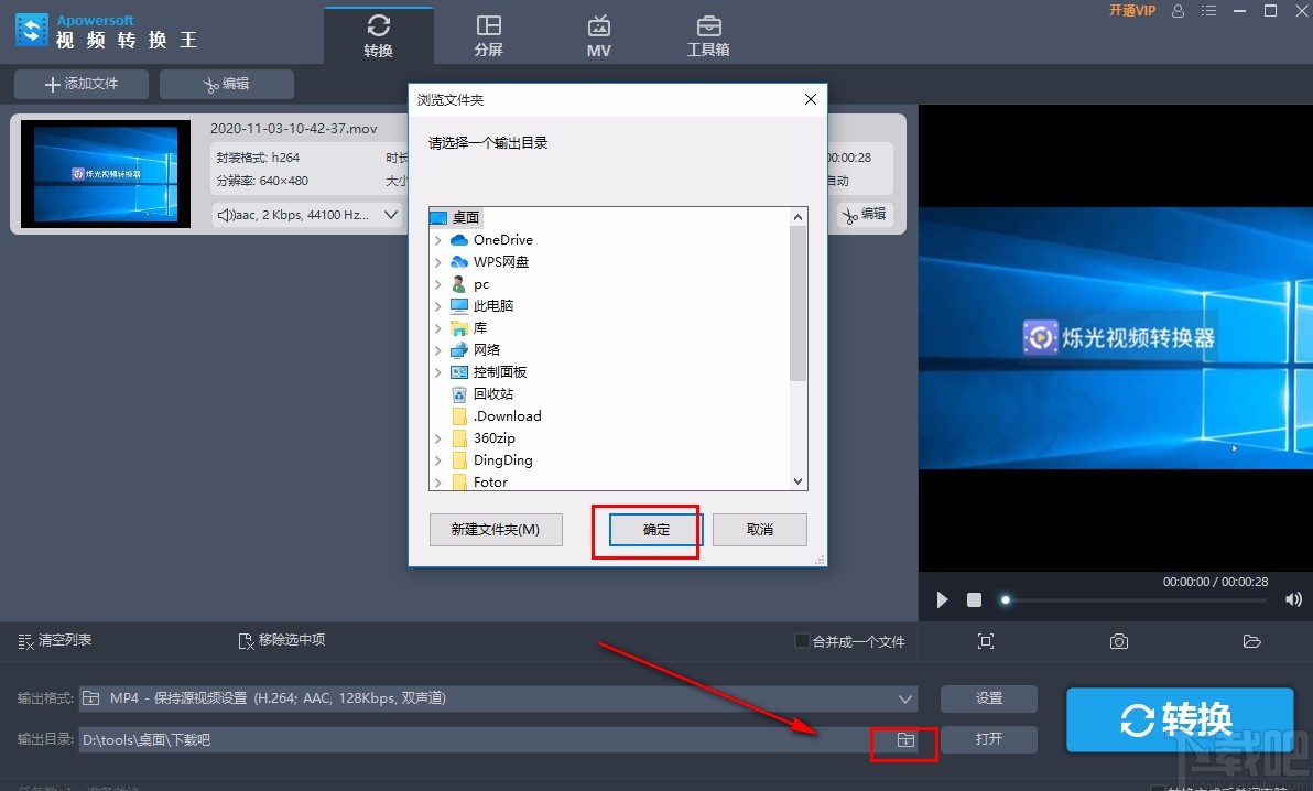 5.接下来在界面下方找到“输出目录”选项,点击该选项后面的文件打开按钮,界面上会出现一个文件输出目录选择窗口;在窗口中设置好视频的输出位置后,再点击窗口底部的“确定”按钮就可以了。