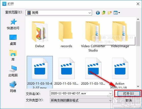 2.接着在文件添加页面中,我们选中需要转换格式的视频文件后,再点击页面右下角的“打开”按钮即可。