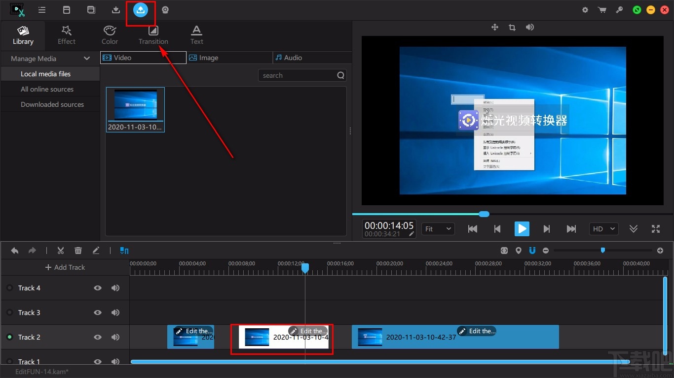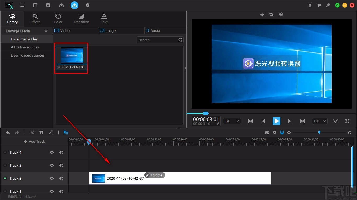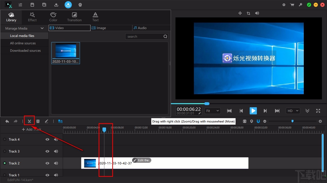 4.将视频添加到软件后,我们在界面左上方选中视频,并按住鼠标左键不动,同时移动鼠标,将其拖拽到下方的时间轨道上。