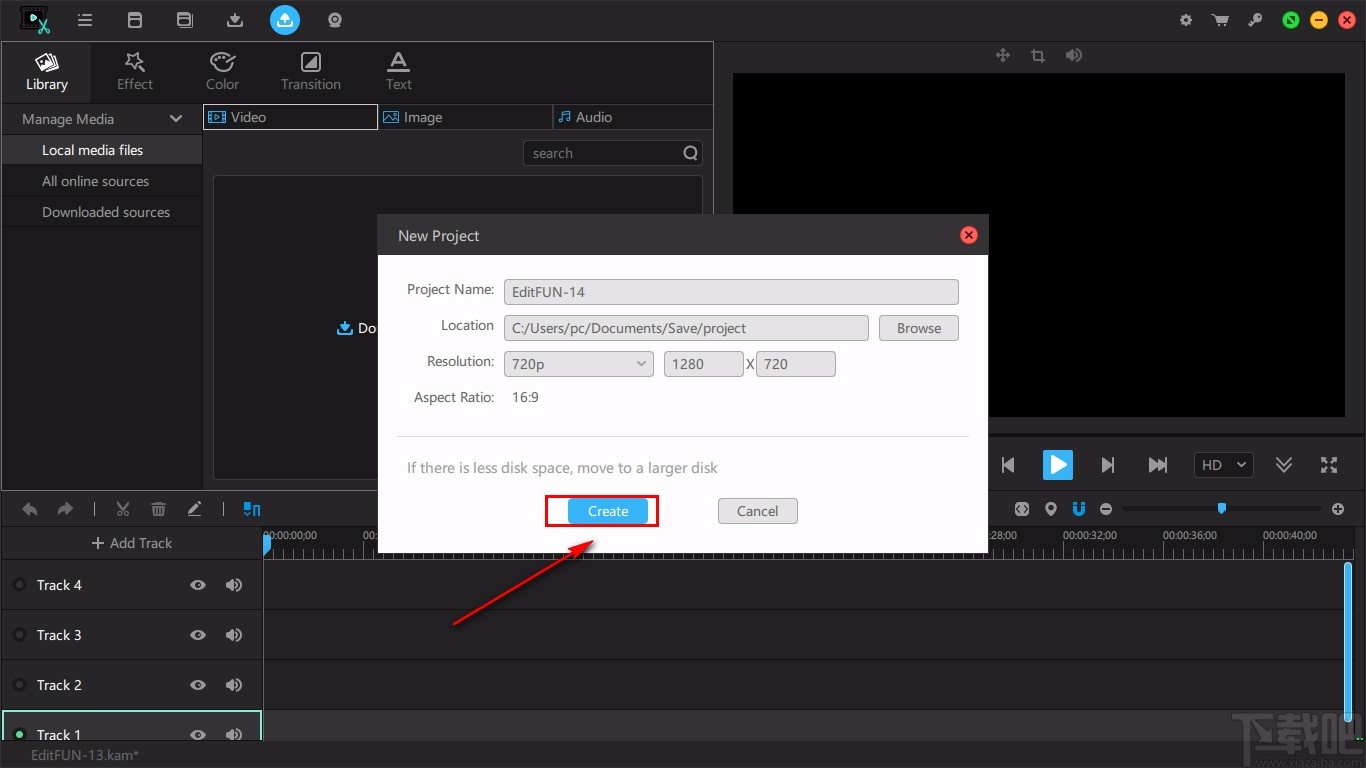 2.接着界面上就会出现一个窗口,我们在窗口中可以对项目名称、位置以及分辨率进行设置,再点击窗口底部的“Create”按钮即可。