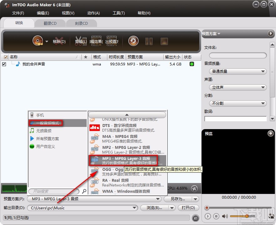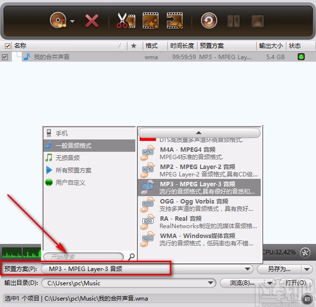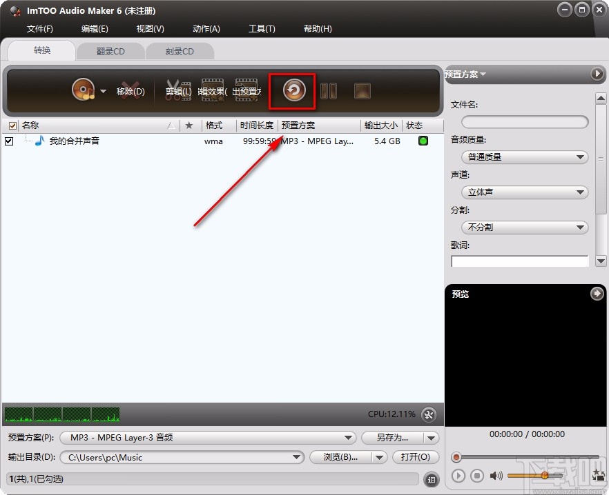 3.将音频文件添加到软件后,我们在界面左下方找到“预置方案”选项,点击该选项后面的下拉按钮。