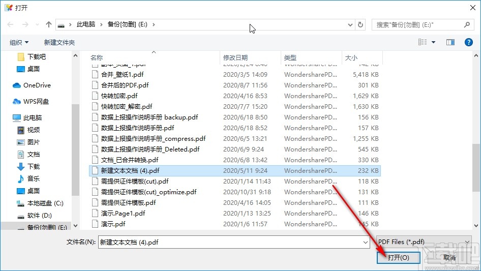 2.点击添加之后下一步就打开下图所示的选择文件界面了,选中目标PDF之后点击右下角的打开按钮。