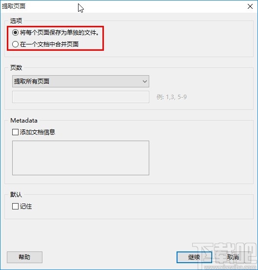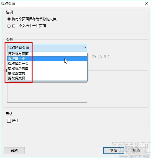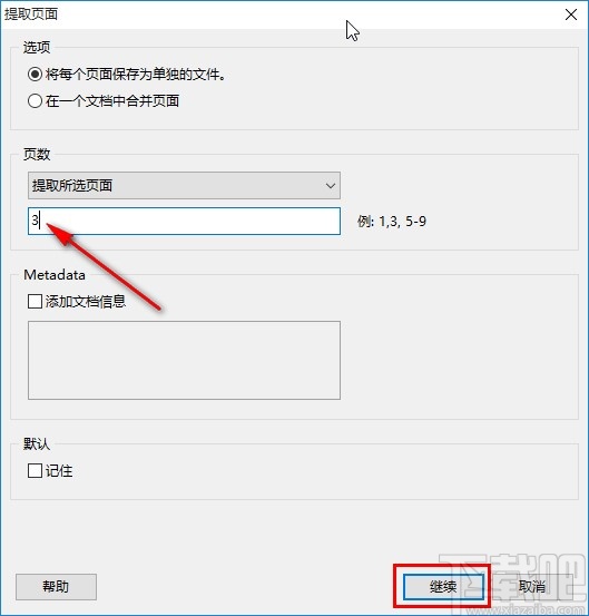 6.如果选择为提取所选页面的话,还需要在下方的输入框中,输入自己想要提取的页面页码,如下图中所示,设置完成之后点击继续按钮。