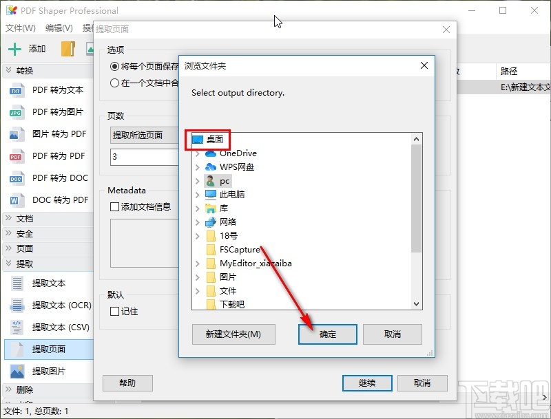 7.点击继续按钮之后,就会出现一个选择保存文件路径的页面,根据自己的需求选择好想要保存提取页面的路径之后,在界面中点击确定按钮即可。