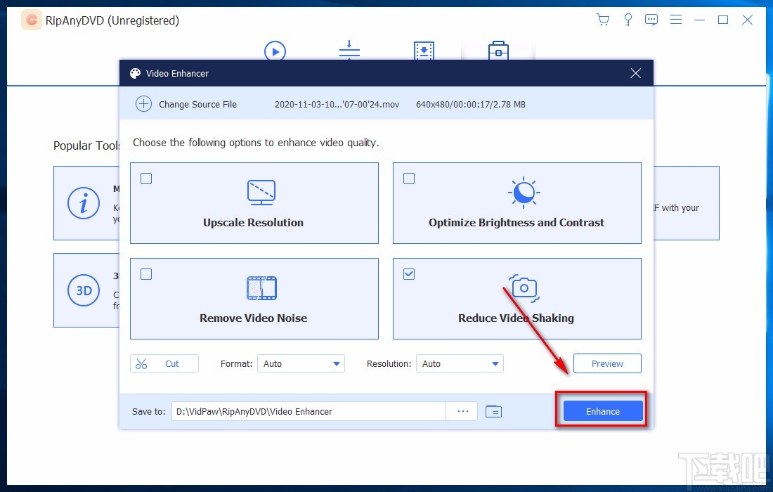 8.完成以上所有步骤后,我们在界面右下角找到蓝色的“Enhance”按钮,点击该按钮就可以给视频减震了。