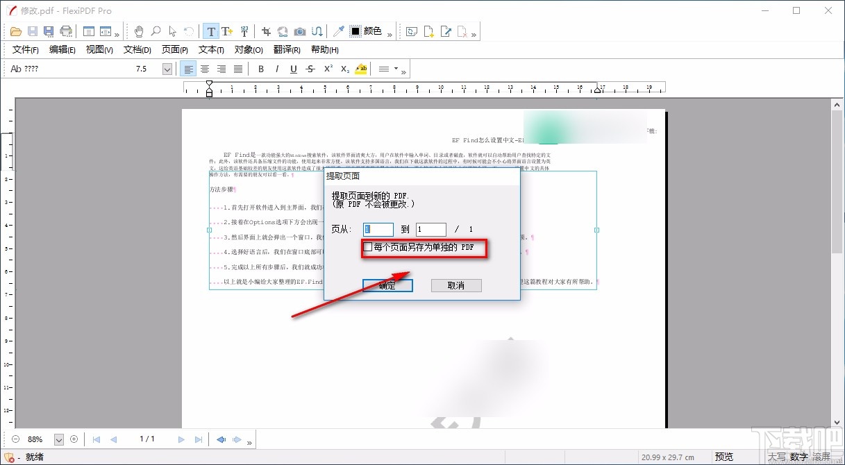 5.在窗口中还可以找到“每个页面另存为单独的PDF”选项,我们根据自己的需要决定是否勾选;并点击窗口底部的“确定”按钮。