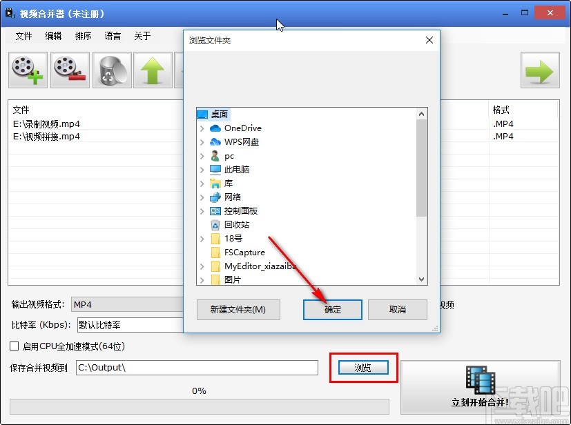 7.最后还有一个设置视频保存路径的选项,点击浏览按钮之后在出现的界面中就可以选择想要保存合并视频的路径,点击确定按钮保存路径。