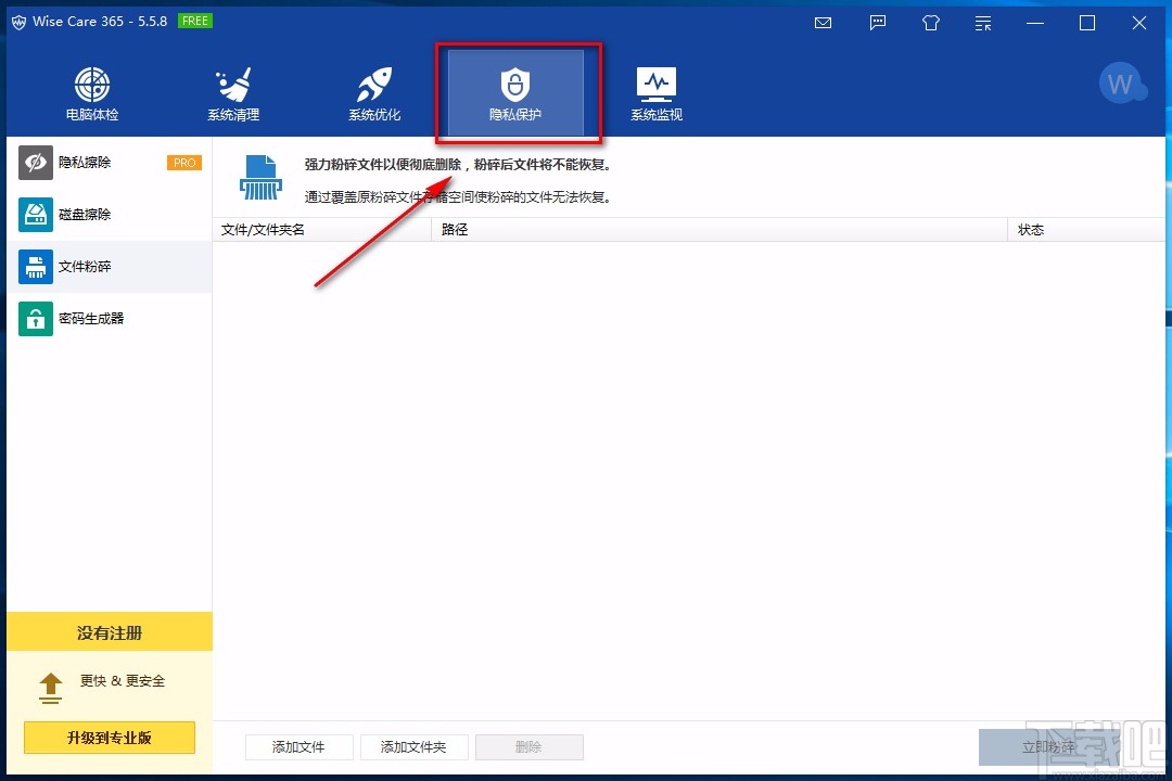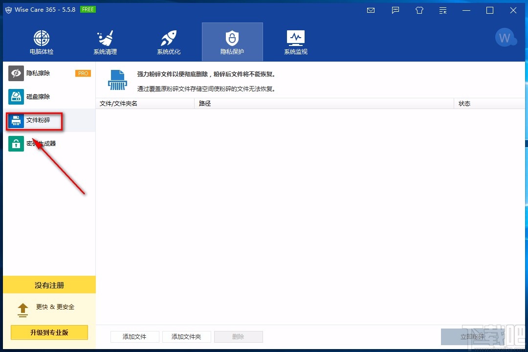 Wise Care 365是一款十分专业的系统优化软件,该软件界面简单直观、功能强大,拥有丰富的系统清理以及优化功能,不仅可以帮助用户扫描电脑中的安全问题,还可以清除浏览记录、粉碎文件等。相信很多人都和小编一样,遇到过怎么也无法将一些文件删除的情况。这时候我们就可以使用这款软件,将需要删除的文件进行粉碎操作,这样就可以彻底删除文件。鉴于很多朋友不知道怎么对其操作,那么接下来小编就给大家详细介绍一下Wise Care 365粉碎文件的具体操作方法,有需要的朋友可以看一看。