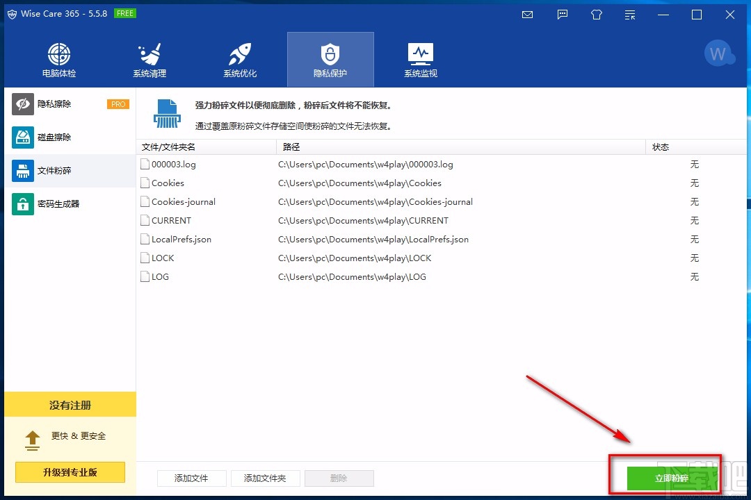 5.将文件添加到软件后,我们在界面右下角找到“立即粉碎”按钮,点击该按钮就可以粉碎文件了。