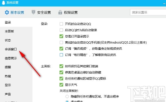 3.点击这个设置选项之后就打开设置界面了,如下图中所示,我们找到左边的会话窗口选项点击切换到它的设置界面。