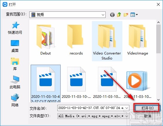 3.在视频添加页面中,我们选中需要进行翻转操作的视频后,再点击页面右下角的“打开”按钮即可。